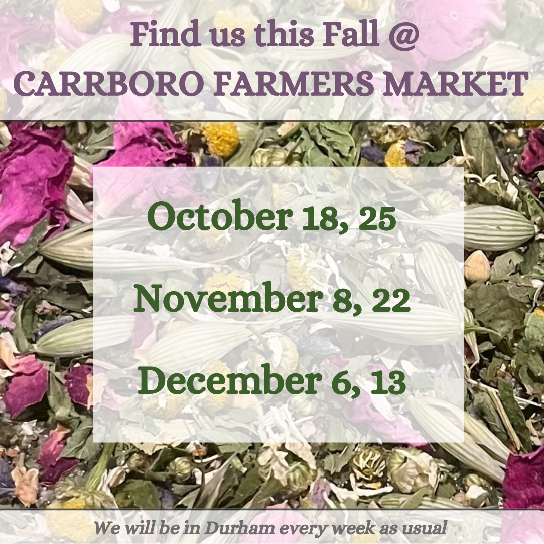 We have been members of the Carrboro Farmers Market since 1981. You can find us at there on SELECT Saturday mornings with an array of fresh herbs, some produce, and our botanical crafts from farm-to-cup herbal teas and fire cider to decadent face creams and aromatherapy facial mists. Along with our NEW functional foods - herbal pestos, dips, and broths